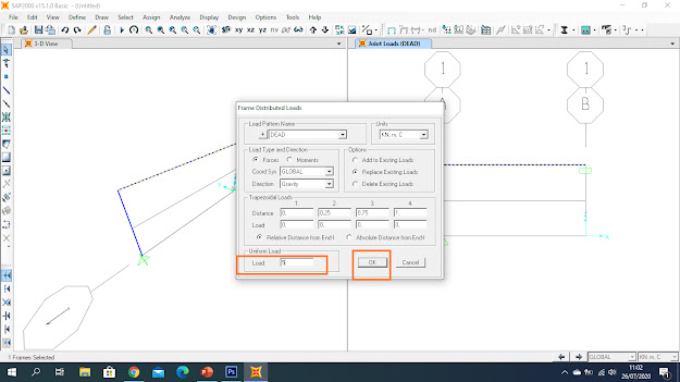 12. Maka akan muncul tampilan Frame distributed load, pada bagian Load ketik nilai beban merata sesuai soal yaitu 5 KN/m > Klik Ok